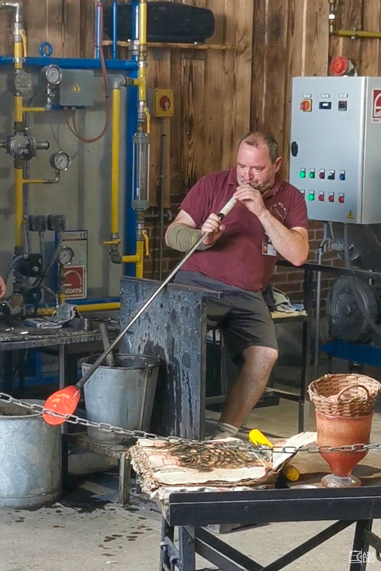 La chaleur déjà présente à l’extérieur, plus les fours en route, l’atelier est un vrai sauna. La démonstration vaut le coup de souffrir un peu ! Un vase prend forme devant nos yeux. Magique et plutôt satisfaisant.